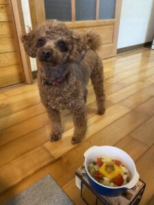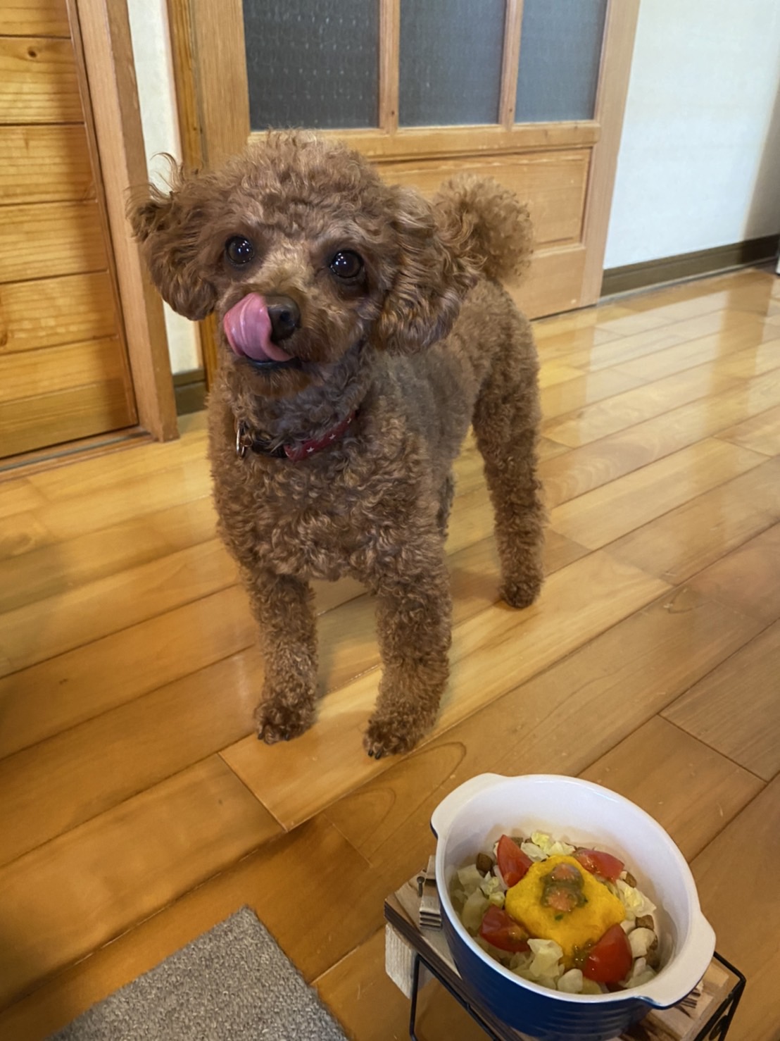 「待て!」の合図で待っている時にペロリと舌出しショットも可愛いですね~ 好物ばかりの手作りケーキワクワクマロン君。